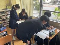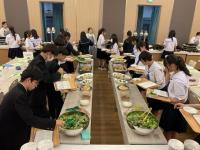 12月17日(水)1・2限、1年4組が家庭科で調理実習を行いました。栄養満点の牛乳をおいしく食べられるアレンジ料理「牛乳もち」です。山田先生の説明を聞いて調理開始、栄養教諭の四藤先生からも牛乳の豊富な栄養素などについて詳しく学びました。楽しい調理の時間の後は、みんなでおいしく味わいました。この授業は1年生の全クラスで今週中に行う予定です。