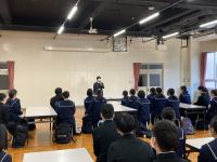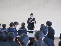 12月5日の6限目に、本校体育館にて3年生を対象とした武道の紹介授業が行われました。今回は銃剣道と弓道の方々が来校され、デモンストレーションや映像を交えながら各競技について説明していただきました。中学生にとってはあまり馴染みのない競技のようでしたが、デモンストレーションや映像から伝わってくる迫力や緊張感に圧倒されていたようです。将来、この中から武道をたしなむ生徒が出てくるかもしれません。銃剣道と弓道を紹介していただいた方々に感謝いたします。ありがとうございました。