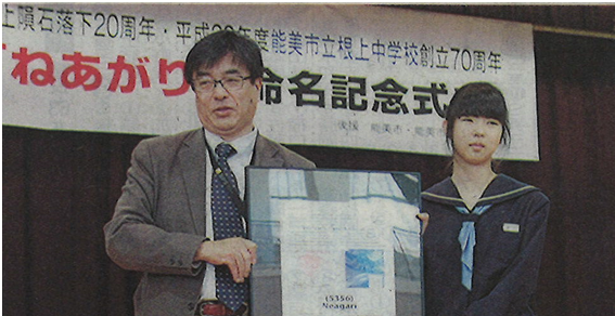 2015年の12月末に「根上星の会」や札幌にお住いの天文家、渡辺和郎さん、JAXA元職員の寺門さんのご厚意とご尽力で、太陽の周りを周る惑星の1つに「Neagari」という名前がつけられました。今年は、その星の発見者である渡辺さんをお招きして、命名記念式典と星に関する講演会を開催しました。渡辺さんから「ふるさとの名前がついた星があることを知っておいてほしい」とのお話でした。また森記念館から地球儀とプラネタリウムをご寄付頂きました。ありがとうございました。