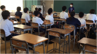 1年生の英語科の授業で、生徒がパフォーマンステストに取り組んでいました。2学期から新しく赴任してきたALTキャサリンと対面して、一人ずつ英会話をします。生徒からは緊張感が伝わってきましたが、キャサリンに励まされ褒められながら英会話をし、終わった後は達成感を得ていたようです。“いいねぇー 根上中”