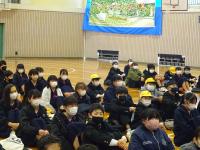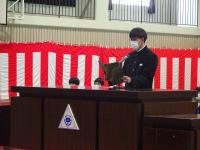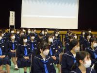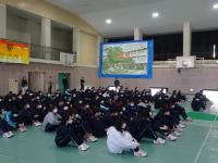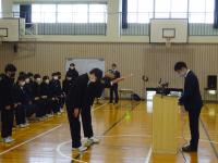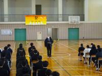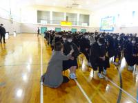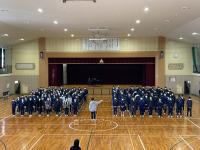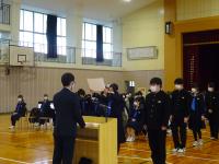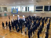 3月20日(月)に体育館にて、生徒心得改訂伝達集会を行いました。今年度は生徒心得のうち「服装・身なり」の項目を見直してきました。先日卒業した後期生徒会役員にも参加してもらい、司会進行はもちろんのこと、はじめの言葉や改訂に向けた想いなどを語ってもらいました。久しぶりに全校生徒が体育館に集まり、全員で改訂の意義や経緯を共有できて本当に良かったと思います。このような取組を通して、生徒には自己指導能力を高め、責任ある行動につなげていってほしいと願っています。