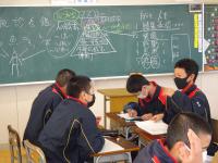 3年生が体育館で式歌練習をしている中、2年生は食堂で、学習に関する学年集会を行いました。1年後に控えた受験に向けて、この時期から意識して取り組んでいくべきことについて、各教科の先生から説明を受けました。3年生が卒業した後は、2年生が最上級生です。最上級生としてふさわしい「意欲的に学びに向かう集団」を目指して頑張りましょう。3年生からのバトンは君たちの手に…。”頑張ろう!根上中新3年生!!”