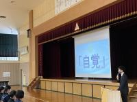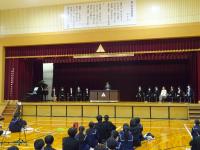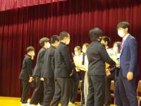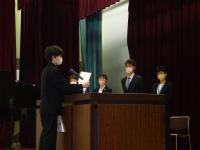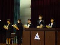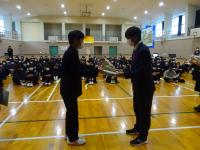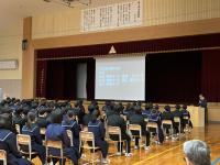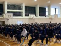 3月20日(月)に体育館にて、生徒心得改訂伝達集会を行いました。今年度は生徒心得のうち「服装・身なり」の項目を見直してきました。先日卒業した後期生徒会役員にも参加してもらい、司会進行はもちろんのこと、はじめの言葉や改訂に向けた想いなどを語ってもらいました。久しぶりに全校生徒が体育館に集まり、全員で改訂の意義や経緯を共有できて本当に良かったと思います。このような取組を通して、生徒には自己指導能力を高め、責任ある行動につなげていってほしいと願っています。