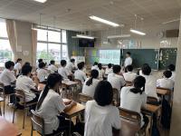 9月24日(火)5限、3年生は総合的な学習の時間にSDGs講演会を行いました。講師は、市の生活環境課SDGs担当の坂本さんと北野さんです。能美市ではSDGsの理念のもと、「暮らしやすさ日本一、実感できるまち」を目標にさまざまな取り組みを推進しています。中学生にとっては、どんな未来をつくり上げていくかを自分たちで考えることが大切だとお話いただきました。SDGsを自分たちの問題と捉え、どのように関わっていくかがこれからの課題です。2学期は、能美市で取り組んでいけるSDGsの新たな取り組みを提言することを目標に、授業を進めていく予定です。