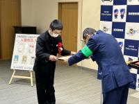 10月25日(金)放課後、能美警察署において防犯かるた絵コンクール表彰式が行われ、2年の中村明仁君が優秀賞を受賞しました。この賞は、能美郡市4校の中学生412点の応募の中から選ばれたものです。中村君は「犯罪が多い中、毎日笑って明るく過ごせるようになってほしい」とかるた絵作成の理由を話してくれました。中村君、おめでとうございます!