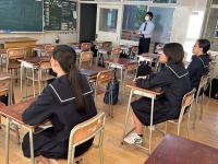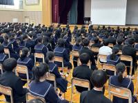 10月30日(水)6限の全校集会では、「ちょっといい話」のコーナーで多保田先生がお話をしてくれました。米津玄師さんの「Lemon」の歌詞「切り分けた果実の片方の様に」や漫画のセリフなどを例として、私たちの周りに潜む国語に興味を持つことの楽しさを教えてくれました。いろいろな先生が専門性を生かしながら、生徒たちの可能性を引き出してほしいと願っています。