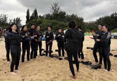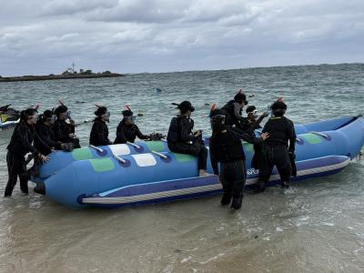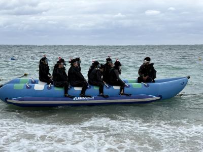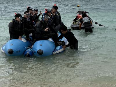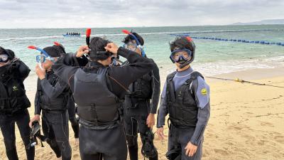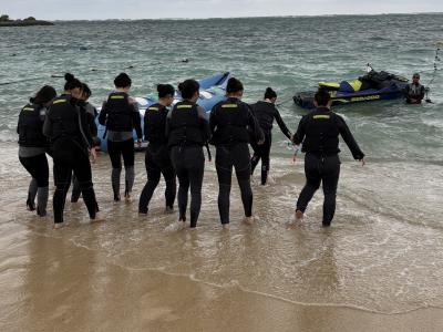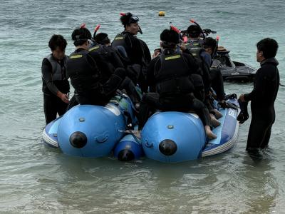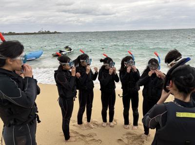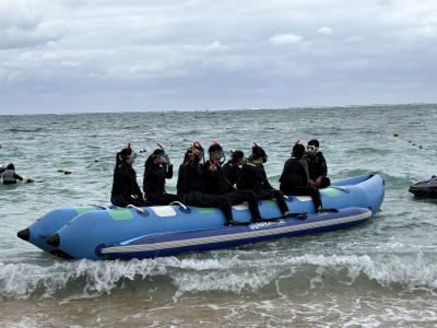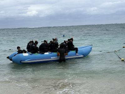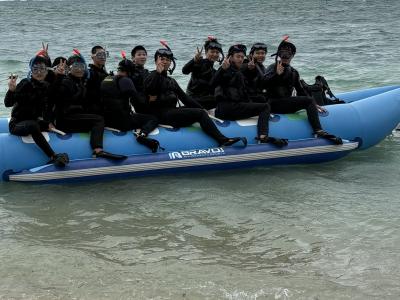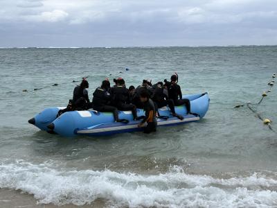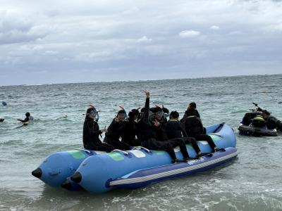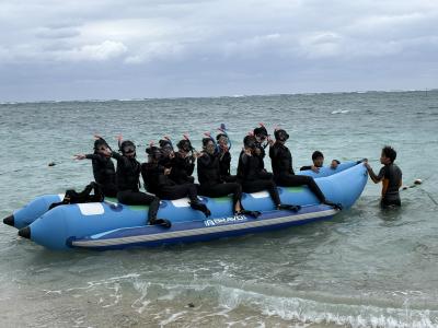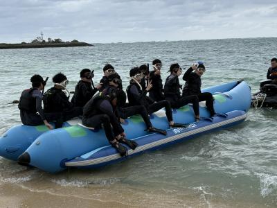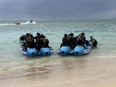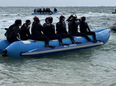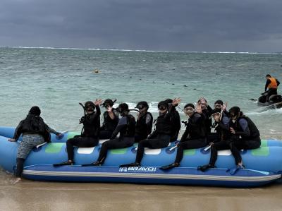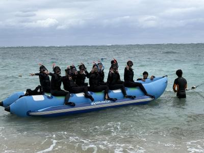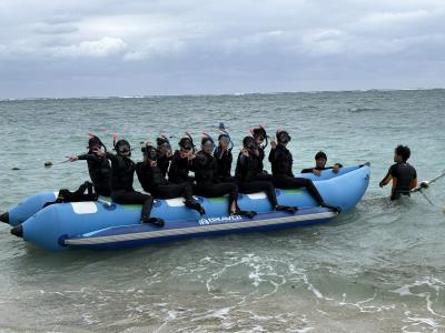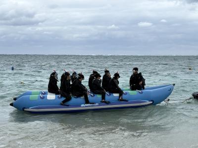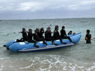 マリン体験ではバナナボートに乗って沖まで進み、シュノーケリング体験をしました。風は強めだったものの、ウェットスーツとライフジャケットに身を包み、充分な浮力を得ながら楽しく泳ぐことができました。