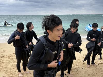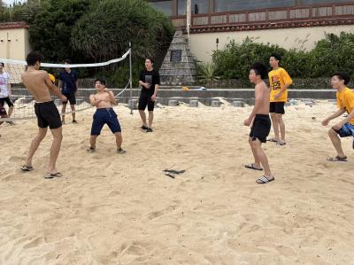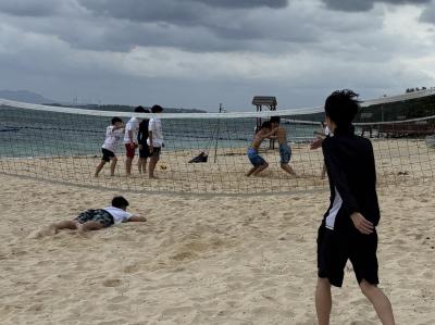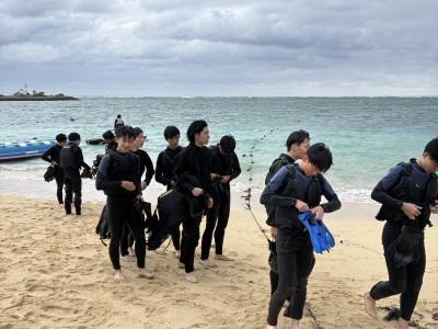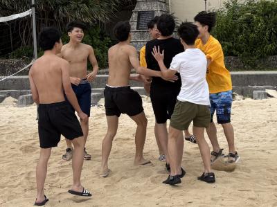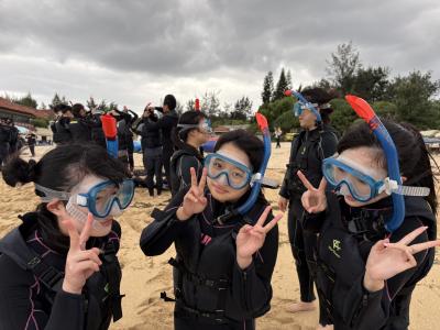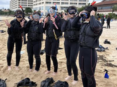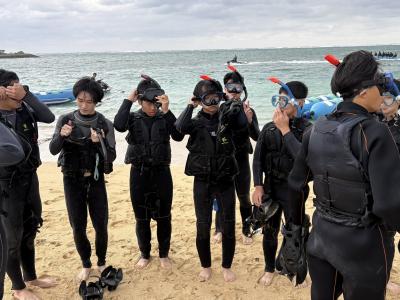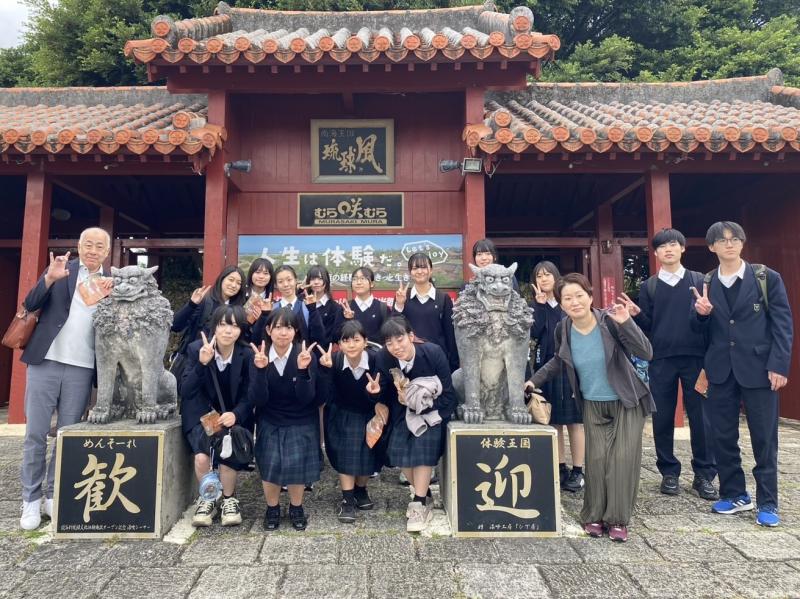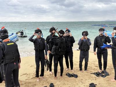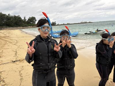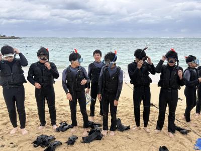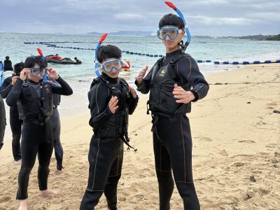 マリン体験、カヤック体験、ブセナ海中公園グラスボート、むら咲むらでの体験から1つを選択し、体験しました。残念ながら、グラスボートの班は悪天候による中止となったため、琉球村へ行くことに切り替えました。