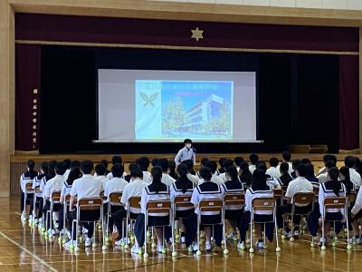 先日、本校中堅教員と一緒に近隣の中学校を訪問し、中3生に向けて本校のPRをしてきました。