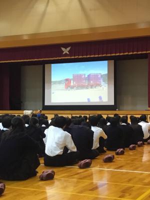 10月20日(金)に、金沢西警察署と石川県トラック協会による交通安全講座が行われました。金沢西警察署の方からは、自転車における交通事故例を紹介していただき、次にトラック協会の方から、大型トラックの死角や内輪差について動画を使って、説明していただきました。晴天ならば、本校駐車場で、大型トラックを実際に走行させて、内輪差を生徒の目の前で実演する予定でしたが、雨で実施不可能となったことは残念でした。しかし、本日の講座で十分、生徒たちは交通事故の怖さを感じ取ったことと思います。自分の命を守るために、自転車での走行時には、早めのライト点灯、ヘルメット着用など、十分気をつけて欲しいと思います。