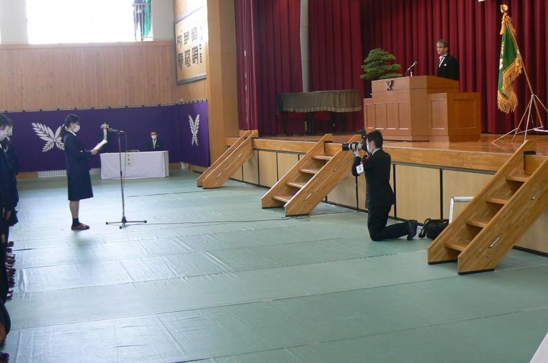 新型コロナウィルスの感染防止のため、例年行われていた前日の各種表彰、同窓会入会式、予行等が中止になりました。3月3日(火)の当日も、在校生は送辞を読む生徒会長の永瀬琴乃さんのみの出席となり、予定されていた「さくら斉唱」も割愛されましたが、卒業生たちは厳粛な雰囲気の中、一人一人の呼名にしっかり応え、卒業生総代として36Hの板緑聖飛くんが山越校長から卒業証書を受け取り、36Hの中島なみゑさんが答辞で高校生活の思い出とともに、これからの決意を述べました。