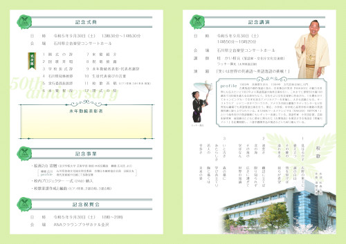 令和5年9月30日(土)に本校創立50周年記念式典及び講演会が石川県立音楽堂で挙行されました。石川県知事 馳 浩様、石川県議会議長 焼田 宏明様をはじめ多数のご来賓の方々のご臨席を賜り、厳かに、かつ生徒のエネルギーがみなぎる活気ある式典であったと思います。