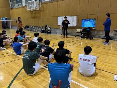 講師として金沢出身で現在日本代表のコーチをしている坂井一将さん(元日本ランク1位、世界ランキング最高15位)、岐阜県郡上北高校の日比野隼平先生を迎え、一瞬の力、爆発力を養うトレーニングや、シングルス、ダブルスのより実践的な練習などを教えてもらいました。