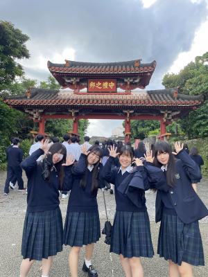 ホテルで朝ごはんを頂いてから、首里城公園へ。生憎の天気ではありましたが、クラス写真を撮る時は雨が上がったり、虹が見えたりする場面もありました。