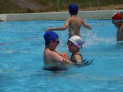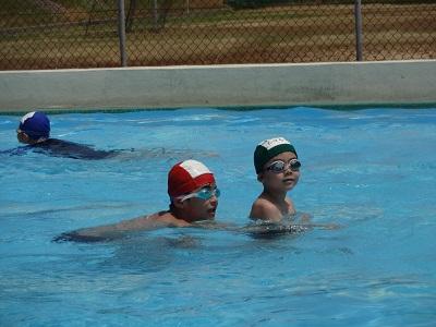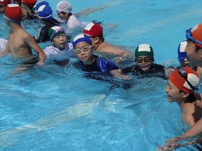 着衣泳を行いました。服を着て泳ぐと、重くていつも通り泳げないことを体験した後、ペットボトルを使って浮いて助けを待ち、命を守る学習をしました。浮くことが難しい1.2年生に5.6年生がやさしく教えてあげる姿が素敵でした。