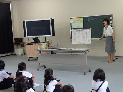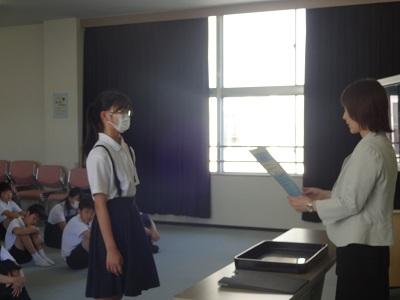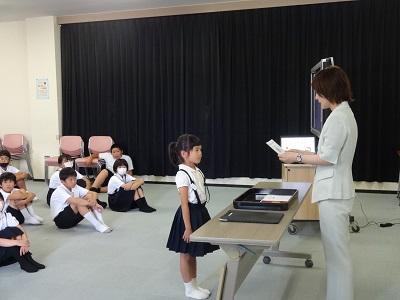 終業式では,読書賞の表彰の後,校長先生のお話を聞きました。「最高の夏休み」にするためにしてほしいことを分かりやすく話してくださいました。続いて「夏休みの生活について」のお話を聞きました。「な・つ・や・す・み」にあわせて,夏休み中の生活のきまりについてお話がありました。これらのお話をしっかりと守って「楽しい夏休み」にしてほしいと思います。