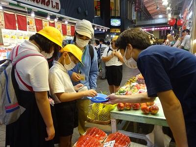 ナディと浅電に乗って近江町市場へ行きました。「紙文房あらき」では、折り紙マンからお話を聞き、店内の作品を見せていただきました。市場の見学では、たくさんの魚や野菜が並べられていること、そしてカニが動いていることに本当に驚いていました。「フルーツ坂野」では好きなフルーツを自分で買って食べました。金沢で観光されている外国の方に話かけて、楽しく交流することもできました。