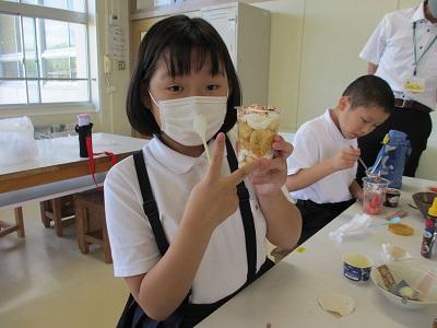 2日(火)に、町の交流会で近江町市場へ行ってきました。交流会3年目の3人は、電車とバスの乗車、お店での買い物は慣れたもので、スムーズに活動していました。買って来た物で何を作るか相談したところ、パフェに決まりました。2日にはフルーツゼリーを作り、3日にはおのおのが2日に作ったゼリーやアイス、買ってきた果物を使って、オリジナルパフェを作りました。どのパフェもとても美味しそうでした。みんなでおいしくいただきました。