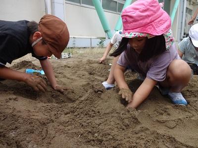 図工「すなやつちとなかよし」の学習で、どろんこ遊びをしました。みんなでなかよく川やトンネルを作ったり、水を流したりして、おもいっきり遊びました。また、プリンカップなどを使ってお料理もして、想像を働かせて楽しんでいました。