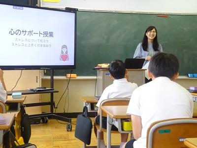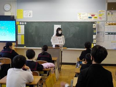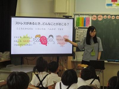 スクールカウンセラーの滋野井先生を講師としてお招きし、心のサポート授業を行いました。ストレスとはどんなものなのか、またストレスに対処する方法について学びました。ストレスへの対処を考え、意見を出し合う場面では、子ども達の中から様々な方法が出されました。中には好きなものを食べる、好きなことをするという意見もあり、そのような方法もとても有効であると教えていただきました。