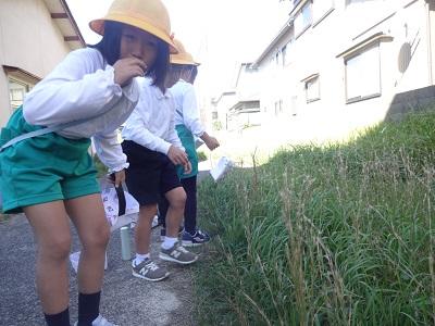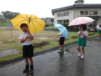 生活科「あめのひのふしぎ」の学習で、校庭に出て雨の日さんぽをしました。かさや地面に当たる雨の音を感じたり、葉や鉄棒に雨粒がついている様子を観察したり、晴れの日とは違う雰囲気を楽しんでいました。