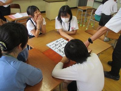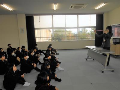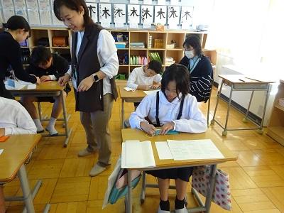 音楽「日本の音楽でつながろう」の学習で、琴の体験をしました。喜多先生に来ていただき、一人ひとり弾き方を教えていただきました。最初は難しそうにしていましたが、だんだん慣れて美しい音が出せるようになってきました。琴の美しい音色に癒されたいい時間になりました。