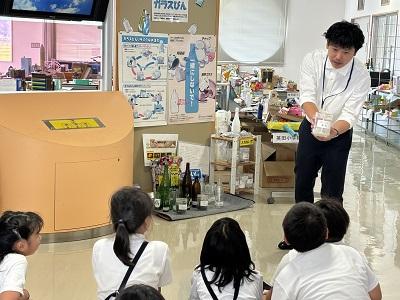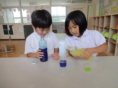 図工「カラフルいろみず」の学習で、水に絵の具を入れて色水を作りました。できた色水同士を「何色になるかなぁ」と考えながら混ぜると、とてもきれいな色水がたくさんできました。できた色水のコップを並べると、ジュース屋さんになりました。上級生のおにいさん、おねえさんに声をかけ、お客さんとして来てもらいました。みんなでカンパイすると、とても嬉しそうでした。
