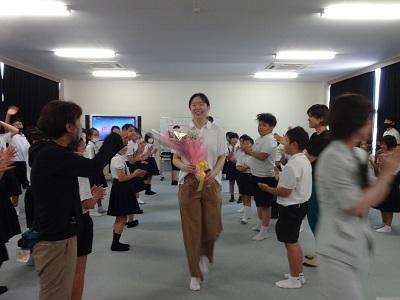 最後に,リリィ先生とのお別れの式。昨年の8月から1年間,子供達に楽しく,元気よく英語を教えてくださいました。本当にありがとうございました。Thank you!! Lili!