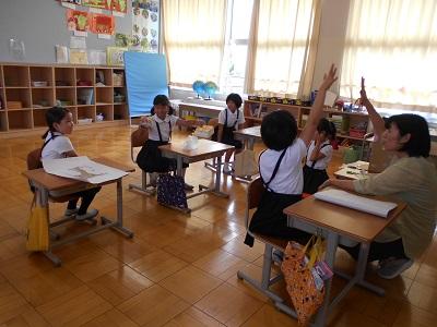 1.2年生が学習したことをクイズにして、それぞれ出し合いました。1年生は国語「つぼみ」の学習で、つぼみクイズを出し、2年生は音楽「音を楽しもう」の学習で、音クイズを出しました。「何の花のつぼみかな」「何の音かな」とよく考えていました。