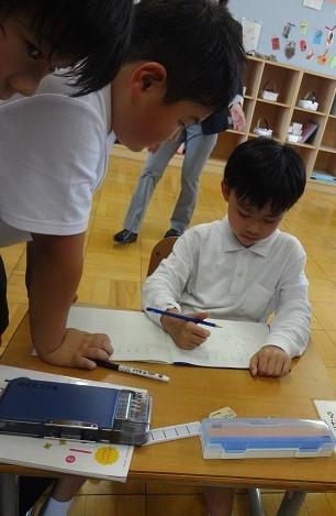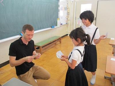 2学期からALTのリリィー先生に代わり、ジャスティン先生とお勉強をします。今回は自己紹介をしました。ジャスティン先生から手描きのかわいい名刺をもらって嬉しそうでした。授業のあと、ジャスティン先生と一緒に給食も食べました。