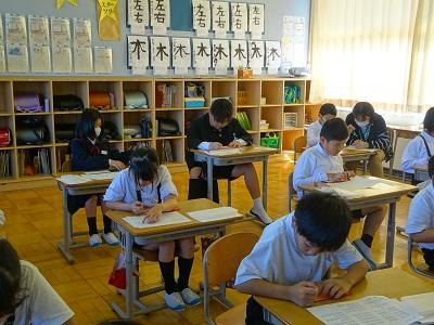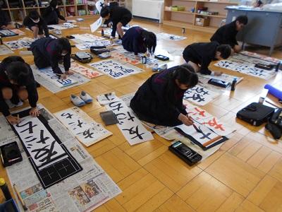 続いて行われた書初め大会では、手本を見ながら真剣に取り組んでいました。書き上げた作品は廊下に展示してありますので、ご都合のつく方はぜひ見に来てください。(展示期間:1/8.9 8:10~16:30)