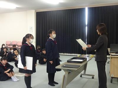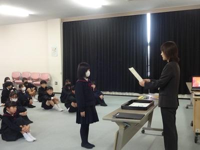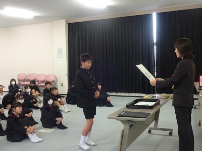 2月の全校集会の様子をお伝えします。今回の表彰は、①国土と交通に関する図画コンクール②校内書き初め大会でした。