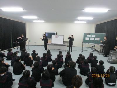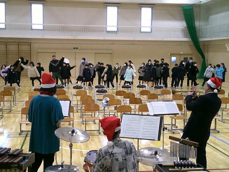 5限目に,「マーチャニーバンド」の皆さんによる「クリスマスコンサート」が行われました。子どもたちは,トランペットやサクソフォン,ピアノの柔らかで明るい音色,マリンバやドラムセットの鮮やかな手の動きに,目を輝かせて聴き入っていました。また,バンドの皆さんの演奏に合わせて「ジャンボリーミッキー」とサプライズ演奏「チェッコリ」を全校で踊りました。大変楽しいコンサートになりました。