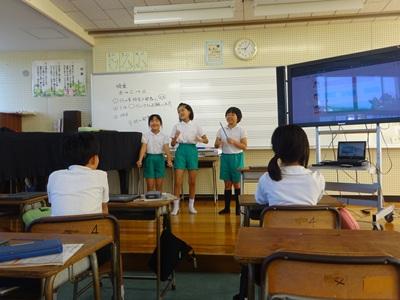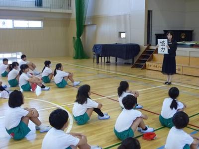10月の全校集会の様子です。校長先生の話「協力」、学習目標「分かりやすく伝えよう」の話をしっかり聴くことができました。続いて企画委員会より生活目標「気持ちよいあいさつをしよう」のコツ㋐㋑㋒㋓㋔の発表がありました。素敵なあいさつがあふれる10月になるといいですね!