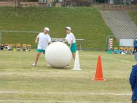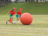 全校団競は、大玉転がし。ペアで協力して転がし、チームで大玉をつなぎました。