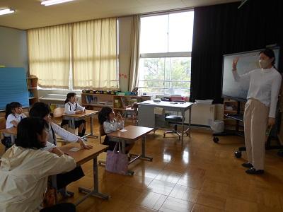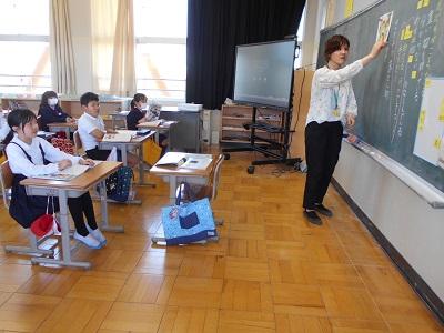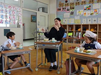 1年生がALTのリリィー先生と一緒に給食を食べました。好きな食べ物やキャラクターなど,たくさん質問しながらの楽しいひと時でした。