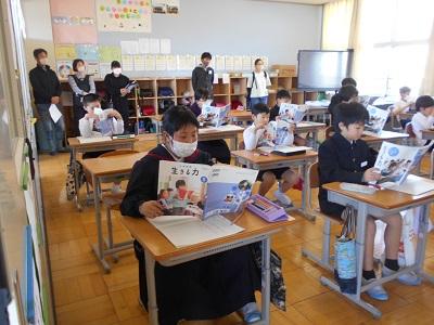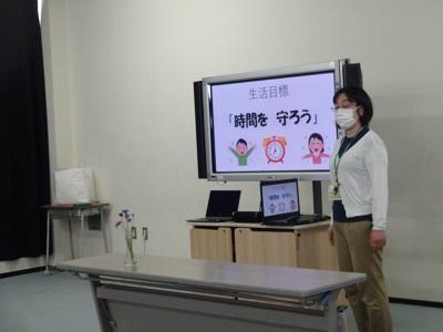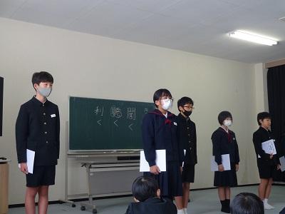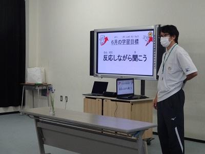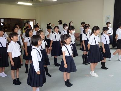 全校集会では、校長先生の話「聞く・聴く・利く」生活目標の話「自分の仕事を忘れずにしよう」学習目標の話「ノートを分かりやすく書こう」の後、校歌を歌いました。元気いっぱいの歌声が会議室に響きました。