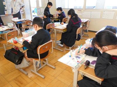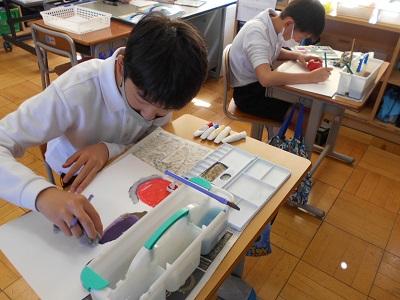 今日の課題は<3原色(赤・青・黄)と白を使って,絵を描こう>です。トマト,ナス,じゃがいも,むらさき花だいこん等から,自分の描きたい野菜や花を選び,形や色をよく見て,筆を動かしていました。さすが高学年と思わせる仕上がりでした!