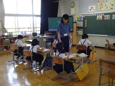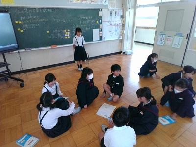 今日は1~4年生の授業の様子を紹介します。1.2年生は国語、3.4年生とひまわり学級は算数、あかしあ学級は広い運動場を3人でのびのびと使用していました。3.4年生の算数では、学習リーダーが進行役となり、自分達で授業を進めていきます。子ども達の自然に関わり合う姿がとても素敵です!