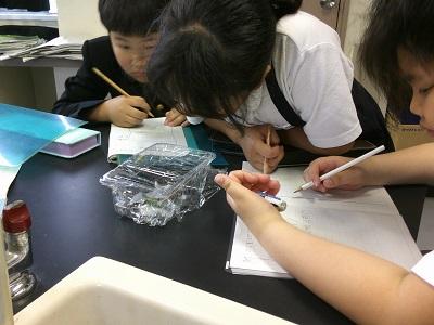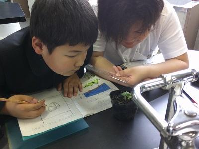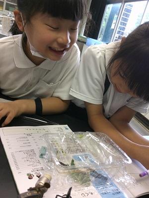 理科の学習の一環で、ヒマワリやホウセンカなどの植物、チョウを育てています。先日ヒマワリ、ホウセンカともに発芽し、子葉の形のちがいなどを観察しました。また、チョウはたまごから幼虫になり、さなぎになっているグループもあります。「早く花がさかないかなあ」「チョウになるのが楽しみだな」という声が聞かれ、お世話もすすんでしています。