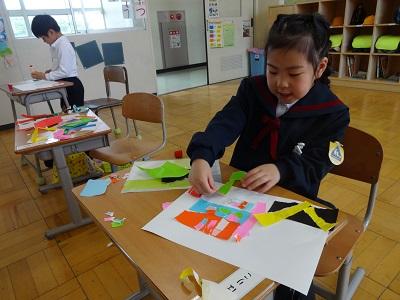 図工「やぶいたかたちからうまれたよ」の学習で、破いた紙をよく見て「これは〇〇に見える!」と楽しく発想を広げて作品を仕上げました。偶然できた形から、こいのぼりや恐竜が出来上がると、とても嬉しそうに作品を見せてくれました。
