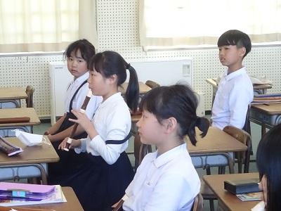 全校で校歌を歌った後、校長先生の話「自分の花」、生活目標の話「時間を守ろう」、学習目標の話「反応しながら聞こう」を聞きました。どの話にも真剣に耳を傾け素直に反応を返す姿が素敵でした。