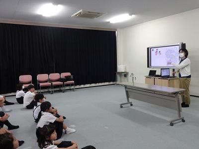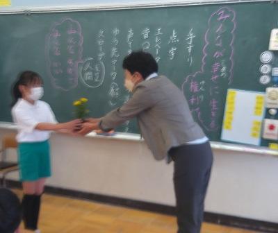 総合の時間に人権擁護委員の長谷川先生に来ていただき、人権についてお話を聞きました。人権とはだれもが幸せに生きる権利であること、「みんなちがってみんないい」から、差別してはいけないことなど、たくさん教えていただきました。その後みんなで人権の花を植えました。子ども達は、「これから自分のこともみんなのことも大切にしていきたい」「みんなが幸せに生きるために人権を守っていくことが大切なんだな」等の声が聞かれ、とても有意義な時間となりました。