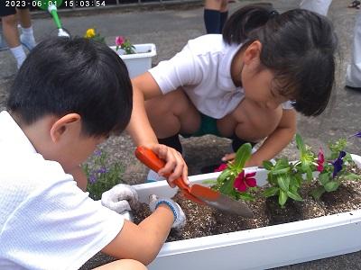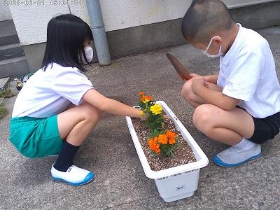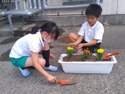 生活科「わたしのはなをそだてよう」の学習で、あさがおの種をまきました。指先で土に穴をあけ種を入れると、やさしくそっと土のおふとんをかけてあげました。早く芽が出てほしいとわくわくしていました。これから毎日水やりをして、大切に育てていきたいですね。