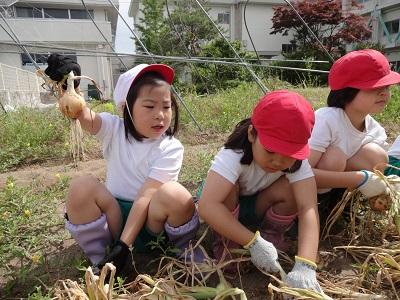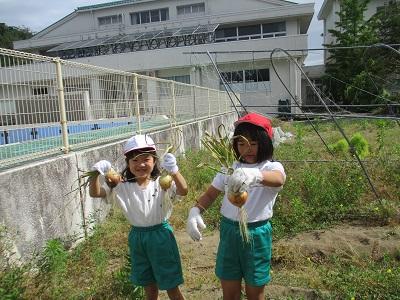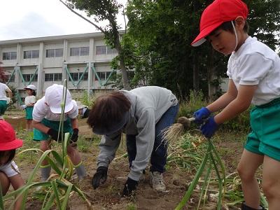 西荒屋小学校の畑で,玉葱とニンニクの収穫をしてきました。畑の先生である二ツ谷さんが,去年の秋に植え,大切に育ててくださったものです。いろいろな大きさの玉葱があり,子ども達は収穫するたびに嬉しそうに見せてくれました。そして「スープにして食べたいな。」などとワクワクしながらお家に持って帰りました。