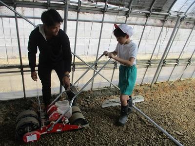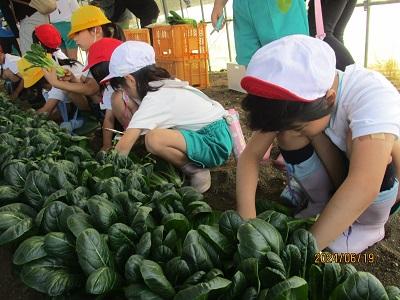 生活科、社会科の学習で、笠間農園へ行きました。一人一人小松菜の種まきを体験させてもらいました。種まきは手押し車のような機械を使って行います。また、小松菜をハサミで収穫し、袋詰めしていただきました。お店の商品のようだと、とても嬉しそうでした。今日種まきした小松菜は、7/16に子どもたちが収穫します。収穫された小松菜が給食のメニューに登場するそうです。今からとても楽しみです。