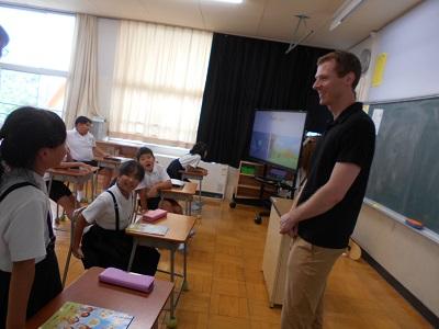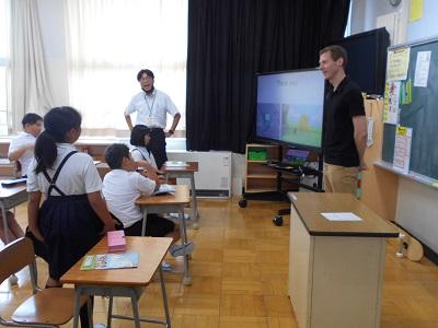 新ALTのジャスティン先生との授業が始まりました。ジャスティン先生のプレゼンや英語での話(時々、日本語も交ります!)に子ども達は興味津々!その後、1人ずつ英語で「My name is~・Ⅰ like~!」と一生懸命自己紹介することができました。Let’s enjoy English class from now on!
