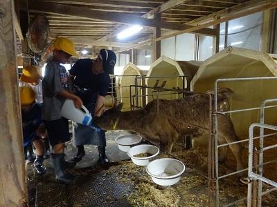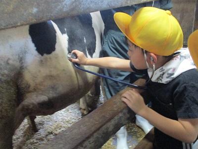 谷内牧場へ行き、牧場の様子を見学させていただきました。谷内さんや獣医の松田さんからお話をうかがいました。子牛にミルクを飲ませたり、聴診器をあてて音を聴いたりと、普段できないような、貴重な体験をさせていただきました。今朝ちょうど産まれた乳牛の赤ちゃんも見ることができ、子どもたちはとても嬉しそうでした。谷内牧場のみなさんありがとうございました。