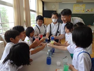 図工「カラフルいろみず」の学習で、水に絵の具を入れて色水を作りました。できた色水同士を「何色になるかなぁ」と考えながら混ぜると、とてもきれいな色水がたくさんできました。できた色水のコップを並べると、ジュース屋さんになりました。上級生のおにいさん、おねえさんに声をかけ、お客さんとして来てもらいました。みんなでカンパイすると、とても嬉しそうでした。