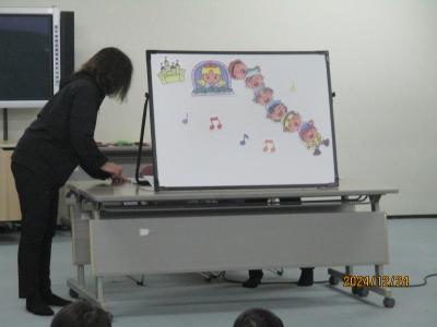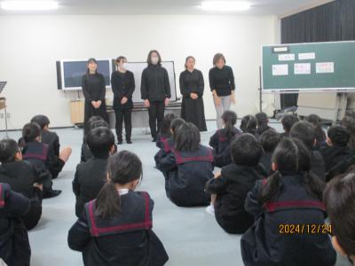 12/24(火)3限目に,クリスマス・パネルシアターが行われました。「金のがちょう」「かさじぞう」「ほしのクリスマス」など,素敵な音楽や語りに合わせた動きに,子ども達はすっかりお話の世界に引き込まれていました。ブラックライトを使ったパネルシアターもあり,色と光の美しさもとても綺麗でした。(写真でお見せできないのが残念です!)